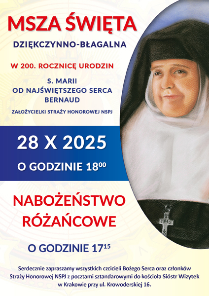 W poniedziałek 13 marca 2023 r. w kościele pw. św. Franciszka Salezego przy klasztorze sióstr wizytek w Krakowie odbyła się Msza św. dziękczynno-błagalna z okazji 160. rocznicy powstania Straży Honorowej Najświętszego Serca Pana Jezusa. Uroczystej Eucharystii, w której wzięło udział dziewięć pocztów sztandarowych z krakowskich wspólnot strażowych, przewodniczył ks. dyr. Krzysztof Zimończyk SCJ. Podczas Mszy św. do Arcybractwa przyjętych zostało dwoje nowych członków: pani Maria z parafii Najświętszego Imienia Maryi w Krakowie oraz ks. kan. Mariusz Susek z parafii św. Jana Chrzciciela w Krakowie-Prądniku Czerwonym.