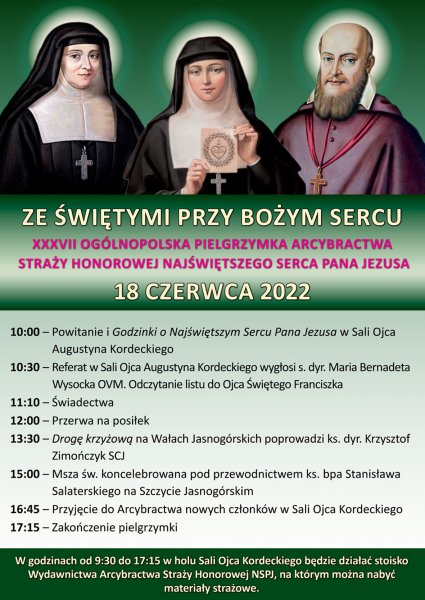 Tegoroczna XXXVII Ogólnopolska Pielgrzymka Arcybractwa Straży Honorowej Najświętszego Serca Pana Jezusa na Jasną Górę odbędzie się w sobotę 18 czerwca pod hasłem „Ze świętymi przy Bożym Sercu”. W tym roku nie obowiązują już ograniczenia liczebności uczestników związane z pandemią koronawirusa, dlatego serdecznie zapraszamy wszystkich członków naszego Arcybractwa oraz czcicieli Bożego Serca z całej Polski do wzięcia udziału w tym wyczekiwanym wydarzeniu.